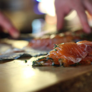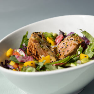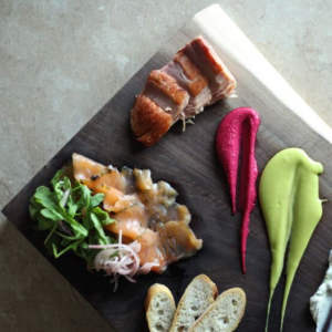 Gravlax, fromage de chèvre aux pacanes, noix caramélisées, roquette, brunoise de poires et agrumes, croûtons et vinaigrette aux herbes sur mesclun